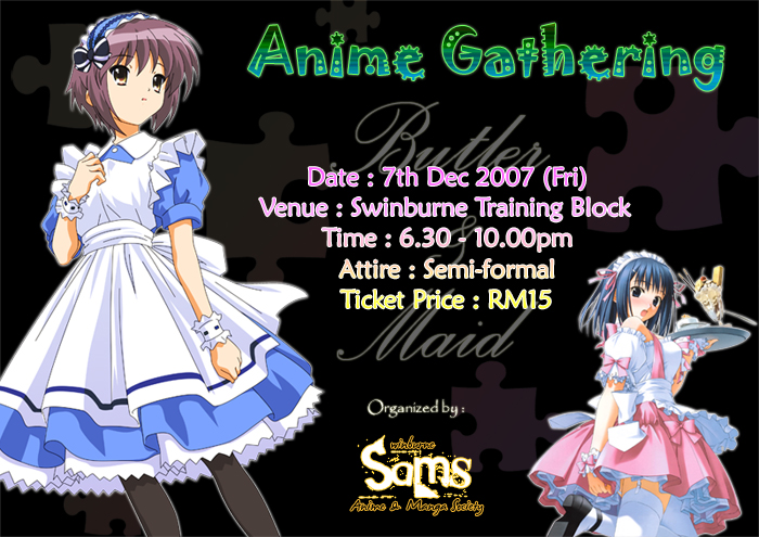 We’re currently finding some sponsors for the Anime Gathering mentioned above, trying my luck here 😛 Interested can contact me here(016-8656122) or msn(applejunk@hotmail.com) and we’ll discuss bout it 😉 Those who sponsors us will get the chance to advertise their name/company/organization during the gathering which may accommodate up to 60 ppl ^^ So, dun miss this chance 😉