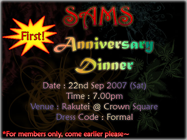 SAMS 1st Anniversary Dinner~! September 16, 2007September 16, 2007 Click the pic to see a larger and clearer view 😉 For outsiders, you’ll hafta pay RM50 ^^ But you can still enjoy 😉 Yay~ Can’t wait for the japanese food XD Comment using your Facebook account: